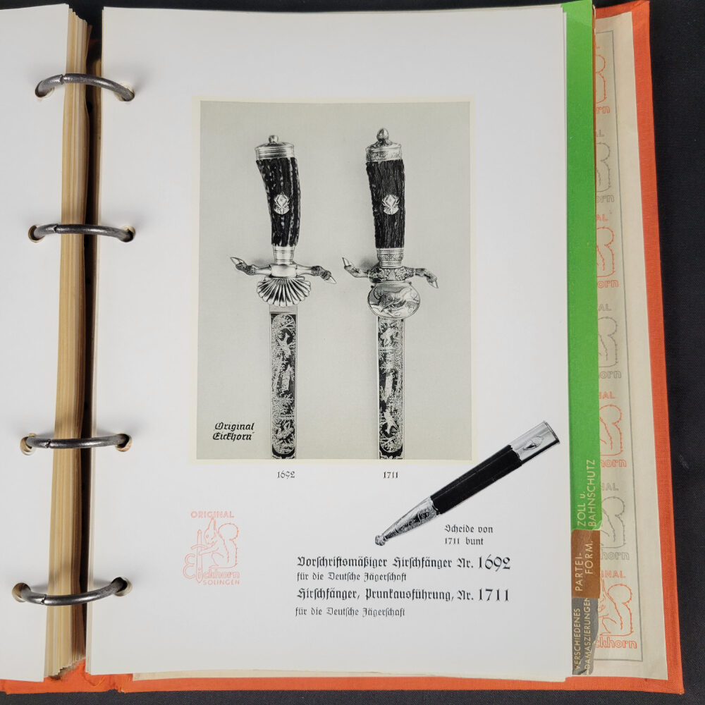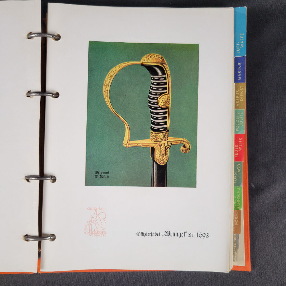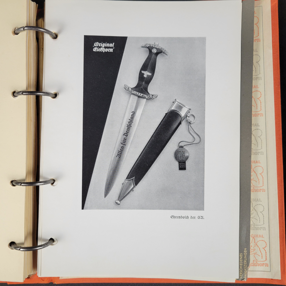 Anyone who collects edged weapons of the Third Reich especially Eickhorn this is a must have catalog. Filled with invaluable period information. This catalog is full of reference material for daggers, swords, bayonets and the factory etchings. This catalog would date to the late 1930’s and bound in the correct four ring binder. The metal binding inside has come loose from the outer cover but remains complete.