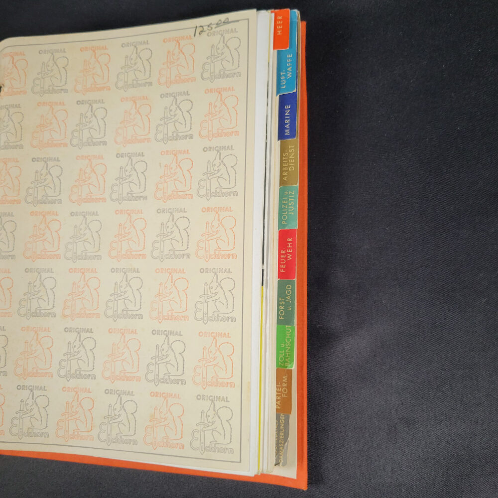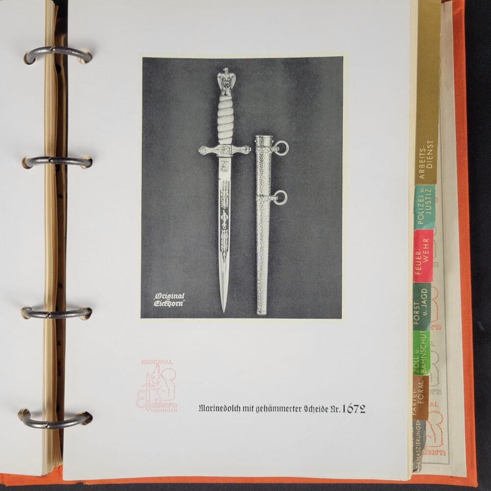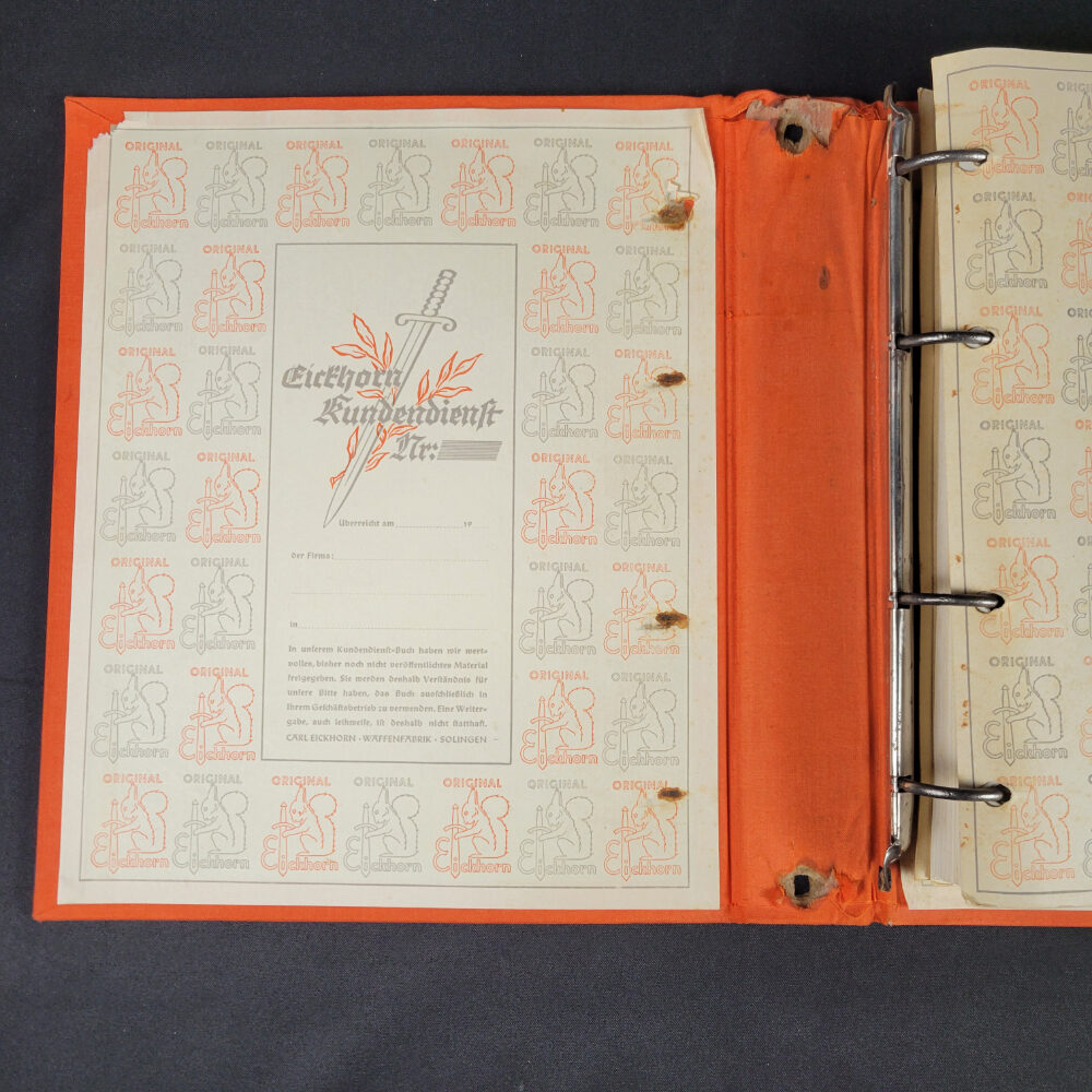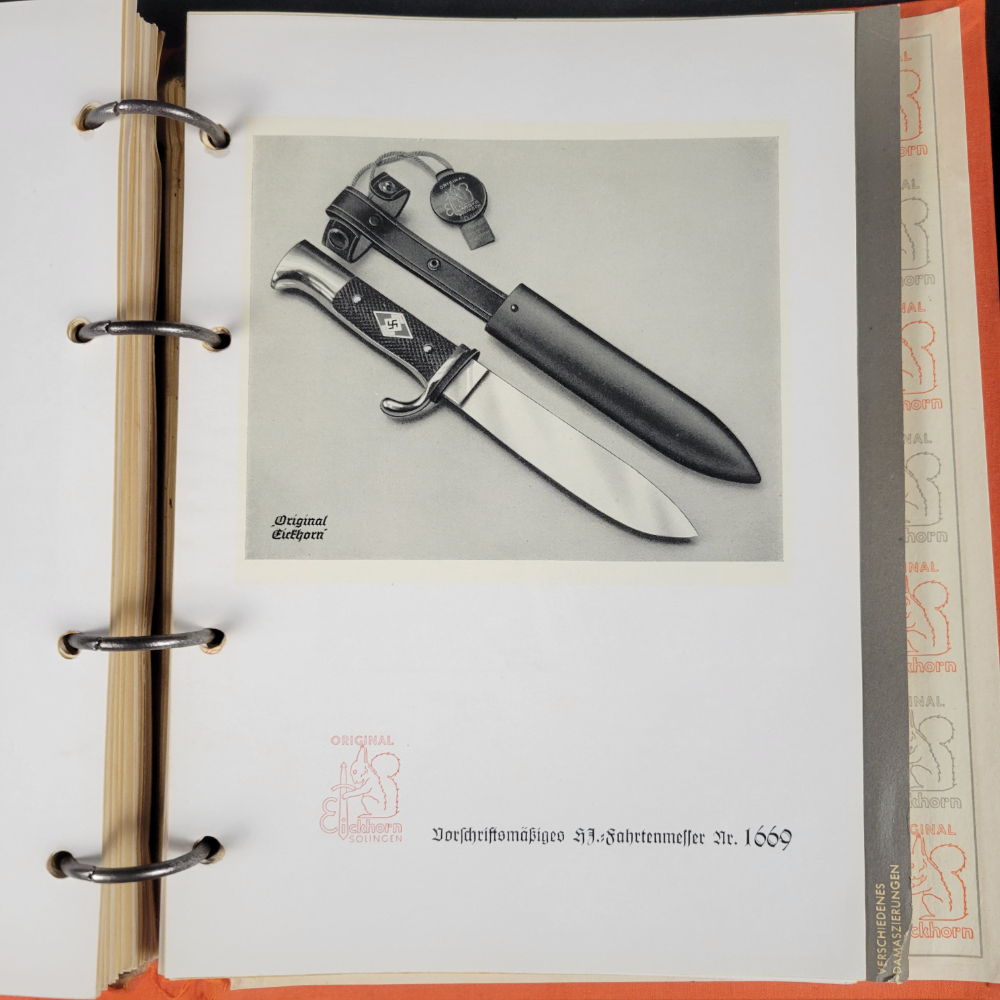 Anyone who collects edged weapons of the Third Reich especially Eickhorn this is a must have catalog. Filled with invaluable period information. This catalog is full of reference material for daggers, swords, bayonets and the factory etchings. This catalog would date to the late 1930’s and bound in the correct four ring binder. The metal binding inside has come loose from the outer cover but remains complete.